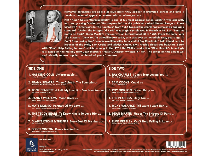 A1 Nat King Cole– Unforgettable 3:11A2 Frank Sinatra– Three Coins In The Fountain 3:05A3 Tony Bennett– (I Left My Heart) In San Francisco 2:52A4 Danny Williams– Moon River 2:35A5 Matt Monro– Portrait Of My Love 2:43A6 The Teddy Bears– To Know Him Is To Love Him 2:22A7 Gladys Knight, The Pips– Every Beat Of My Heart 2:03A8 Bobby Vinton– Roses Are Red 2:40B1 Ray Charles– I Can't Stop Loving You 4:13B2 Sam Cooke– Cupid 2:40B3 Roy Orbison– Dream Baby 2:33B4 The Platters– Only You 2:42B5 Ricky Valance– Tell Laura I Love Her 2:41B6 Dean Martin– Under The Bridges Of Paris 2:47B7 Elvis Presley– Can't Help Falling In Love 3:01