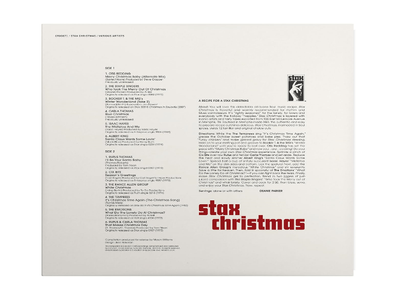 A1 Otis Redding– Merry Christmas Baby (Alternate Mix)A2 The Staple Singers– Who Took The Merry Out Of ChristmasA3 Booker T & The MG's– Winter Wonderland (Take 2)A4 Carla Thomas– Blue ChristmasA5 Isaac Hayes– The Mistletoe And MeA6 Albert King– Santa Claus Wants Some Lovin'B1 Rufus Thomas– I'll Be Your Santa BabyB2 Cix Bits– Season's GreetingsB3 The Rance Allen Group– White ChristmasB4 The Temprees– It's Christmas Time Again (The Christmas Song)B5 The Emotions– What Do The Lonely Do At Christmas?B6 Rufus Thomas, Carla Thomas– That Makes Christmas Day