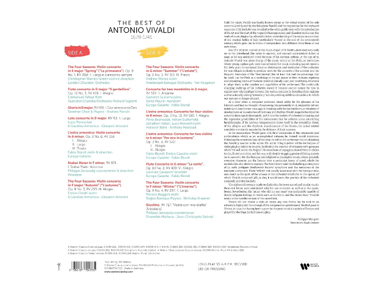 A1 The Four Seasons: Violin concerto in E major “Spring” (“La primavera”), Op. 8 No. 1, RV 269: II.Largo e pianissimo sempreA2 Flute concerto in D major “Il gardellino”, Op. 10 No. 3, RV 428: I. AllegroA3 Gloria in D major, RV 589: I. Gloria in excelsis DeoA4 Lute concerto in D major, RV 93: II. LargoA5 L’estro armonico: Violin concerto in A minor, Op. 3 No. 6, RV 356A6 Stabat Mater in F minor, RV 621: I. Stabat Mater dolorosaA7 The Four Seasons: Violin concerto in F major “Autumn” (“L’autunno”), Op. 8 No. 3, RV 293: III.AllegroB1 The Four Seasons: Violin concerto in G minor “Summer” (“L’estate”), Op. 8 No. 2, RV 315: III.PrestoB2 Concerto for two mandolins in G major, RV 532: II. AndanteB3 L’estro armonico: Concerto for four violins in B minor, Op. 3 No. 10, RV 580: I. AllegroB4 L’estro armonico: Concerto for two violins in A minor “Per eco in lontano”, Op. 3 No. 8, RV 522B5 Flute Concerto in G minor “La notte”, Op. 10 No. 2, RV 439: VI. AllegroB6 The Four Seasons: Violin concerto in F minor “Winter” (“L’inverno”), Op. 8 No. 4, RV 297: II. LargoB7 Giustino, RV 717: “Vedo con mio diletto”(Anastasio)