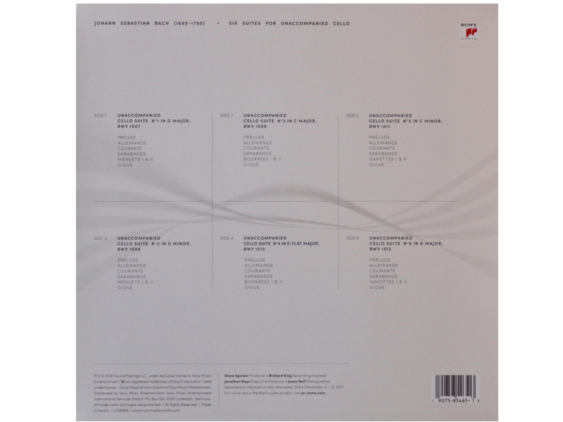 Unaccompanied Cello Suite No. 1 In G Major, BWV 1007 A-1 Prélude 2:30A-2 Allemande 4:15A-3 Courante 2:34A-4 Sarabande 2:30A-5 Menuets I & II 3:27A-6 Gigue 1:57Unaccompanied Cello Suite No. 2 In D Minor, BWV 1008 B-1 Prélude 4:12B-2 Allemande 3:27B-3 Courante 1:48B-4 Sarabande 4:07B-5 Menuets I & II 3:01B-6 Gigue 2:27Unaccompanied Cello Suite No. 3 In C Major, BWV 1009 C-1 Prélude 3:14C-2 Allemande 3:44C-3 Courante 3:08C-4 Sarabande 3:36C-5 Bourées I & II 3:39C-6 Gigue 2:57Unaccompanied Cello Suite No. 4 In E-flat Major, BWV 1010 D-1 Prélude 4:52D-2 Allemande 4:23D-3 Courante 3:51D-4 Sarabande 4:08D-5 Bourées I & II 4:56D-6 Gigue 3:02Unaccompanied Cello Suite No. 5 In C Minor, BWV 1011 E-1 Prélude 6:37E-2 Allemande 5:46E-3 Courante 2:08E-4 Sarabande 3:10E-5 Gavottes I & II 4:28E-6 Gigue 2:47Unaccompanied Cello Suite No. 6 In D Major, BWV 1012 F-1 Prélude 4:44F-2 Allemande 6:39F-3 Courante 3:51F-4 Sarabande 4:01F-5 Gavottes I & II 3:38F-6 Gigue 3:45