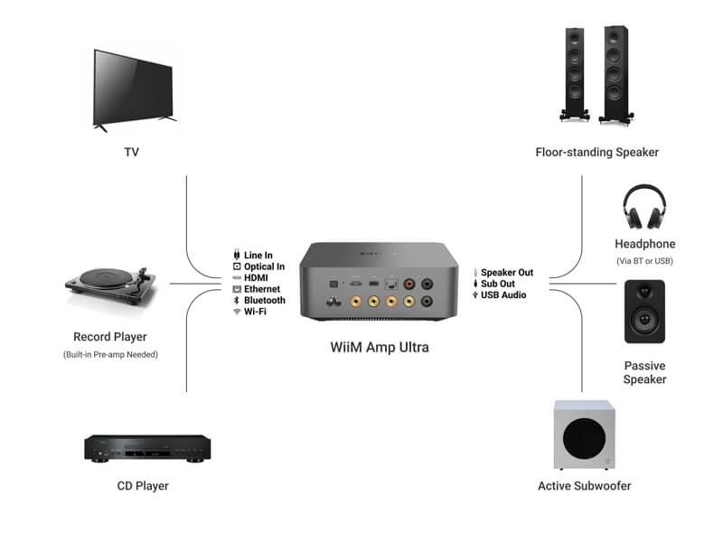 Легко интегрируйте проигрыватели, телевизоры, CD-плееры или транслируйте на любое устройство с поддержкой WiiM или Bluetooth.