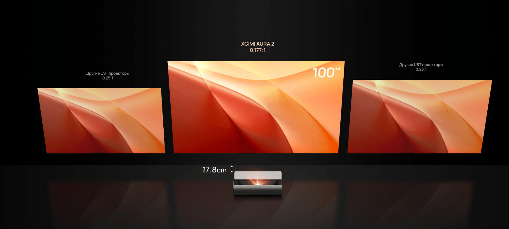 Коэффициент проекции 0,177:1, проецирование 100'' с расстояния 17,8 см Dual Light 2.0 от XGIMI обладает впечатляющим ультракоротким коэффициентом проекции 0,177:1. Просто разместите AURA 2 рядом со стеной, без сложной установки, чтобы создать впечатляющий домашний киноэкран размером до 150 дюймов на коротком расстоянии