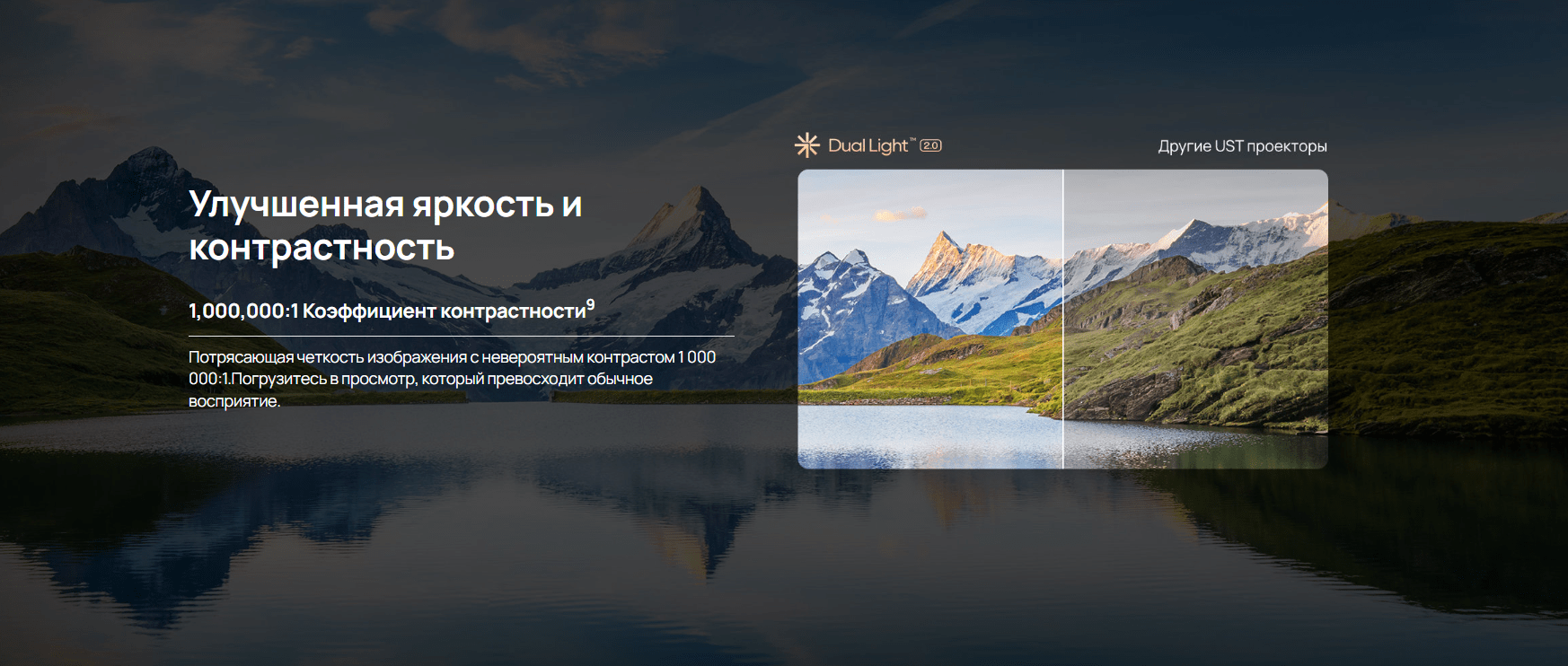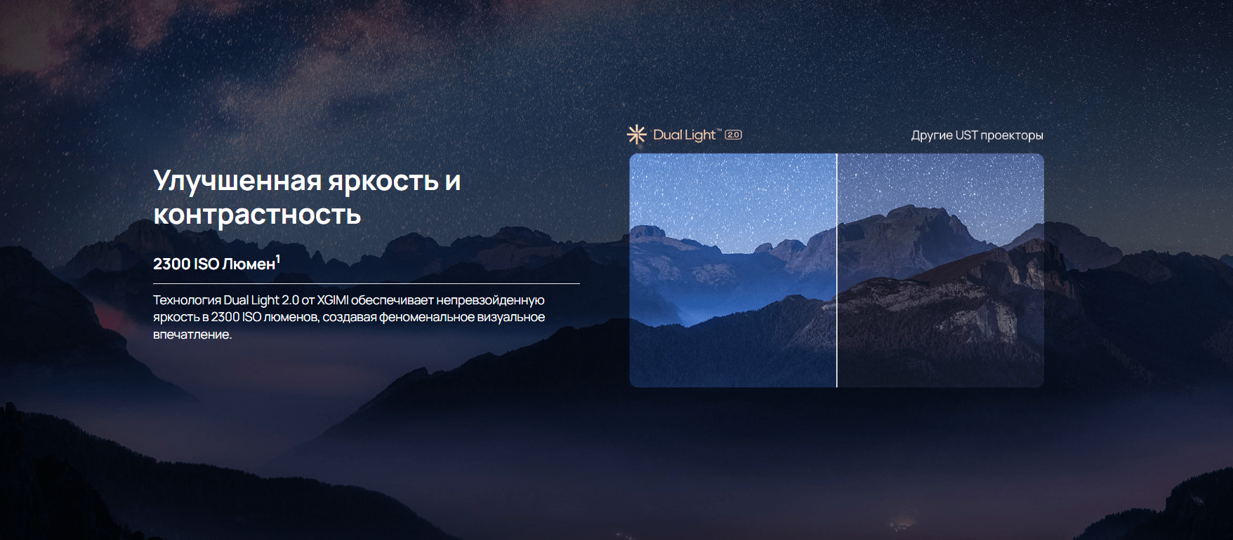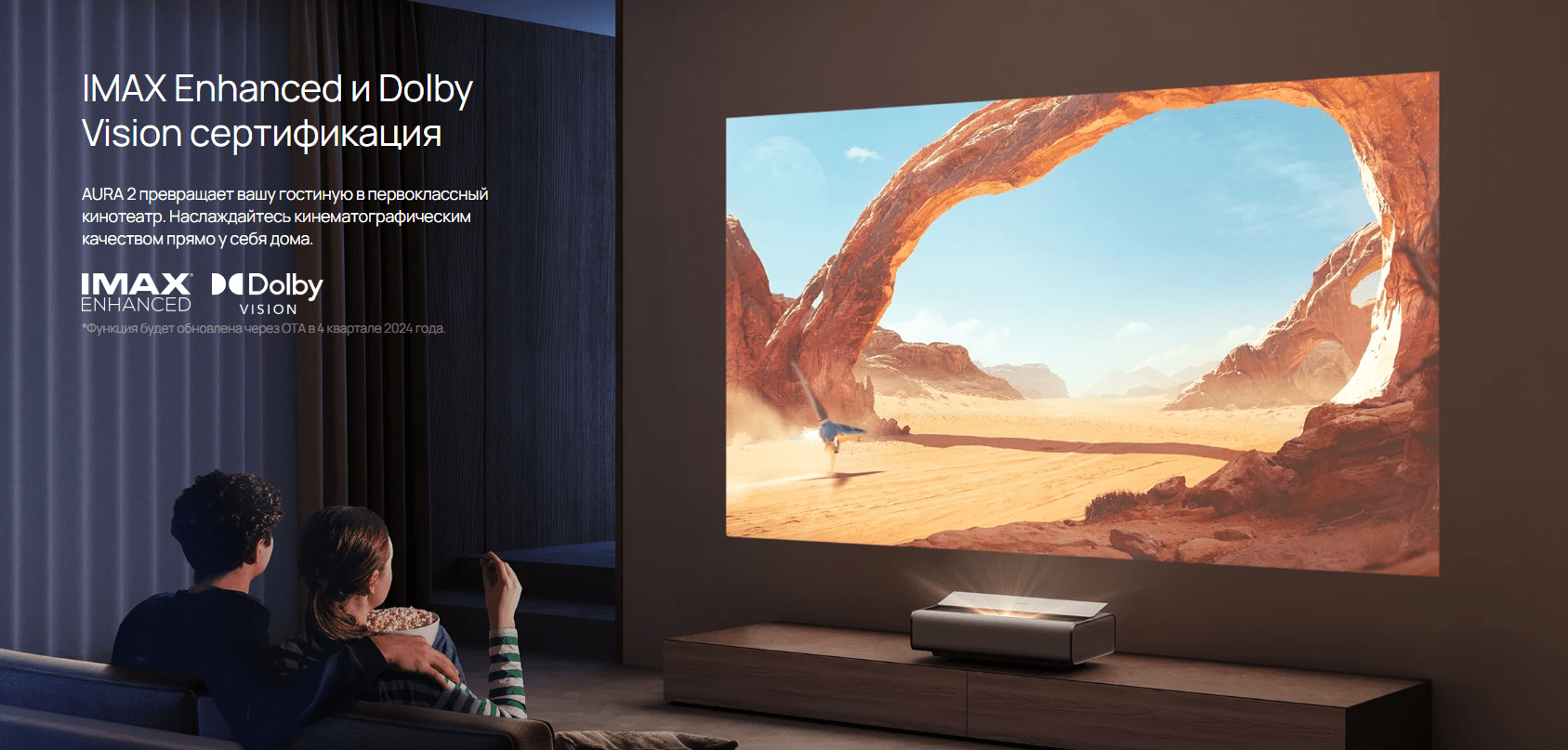 "Ощутите полное погружение в кино с высокопроизводительным ультракороткофокусным (UST) проектором XGIMI. AURA 2 сочетает 4K DLP оптику с лазерным источником "Dual Light 2.0", обеспечивающим яркость 2300 ISO люменов. Наслаждайтесь спортом, играми и фильмами с великолепным контрастом, четкими деталями и превосходной цветопередачей. Высокий уровень яркости делает его идеальным как для дневного просмотра, так и для уютных вечерних сеансов."